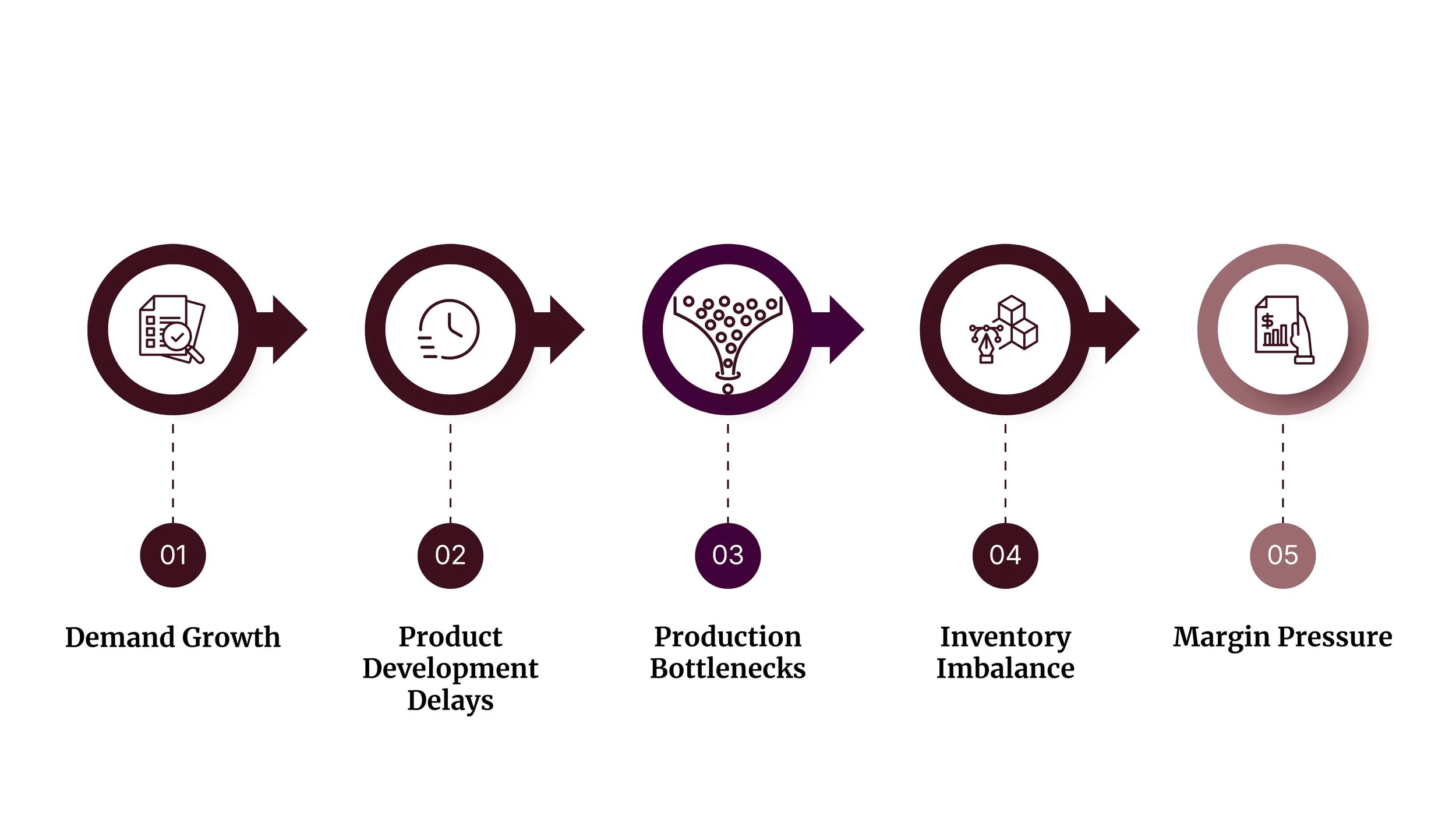 • Product development cycles disconnected from supplier readiness • Fabric sourcing timelines misaligned with production planning • Inventory visibility fragmented across channels • Sales reporting disconnected from supply and production decisions • Margin pressure caused by weak cost transparency across production stages